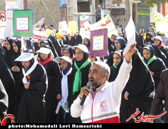 راهپیمایان با در دست داشتن تصاویری از امام خمینی(ره) و رهبر معظم انقلاب و با سردادن شعارهای مرگ بر آمریکا و مرگ بر اسرائیل، انزجار خود را از توطئهها و سیاستهای استکبار جهانی نشان دادند.